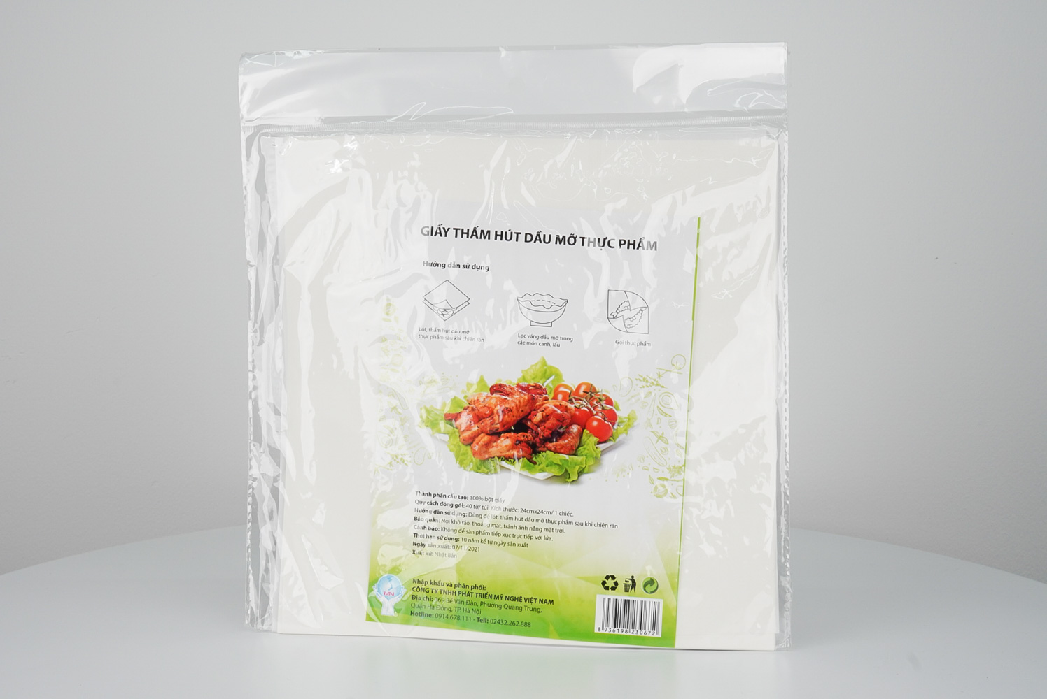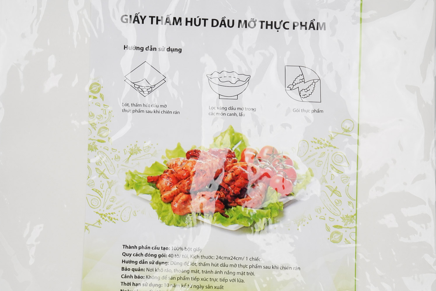 - Hướng dẫn sử dụng: Dùng để lót, thấm hút dầu mỡ thực phẩm sau khi chiên rán