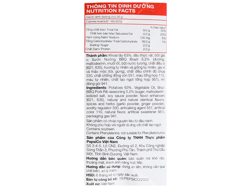 khoai tây, dầu cọ, bột gia vị sườn nướng BBQ 5.2% (đường, maltodextrin, muối, chất điều vị (E621, E627, E631), chất điều chỉnh độ axit E330, chất chống đông vón (E551, E554), màu tự nhiên E160c, chất tạo ngọt E951, màu tổng hợp E110, hương liệu giống tự nhiên, nước tương) |