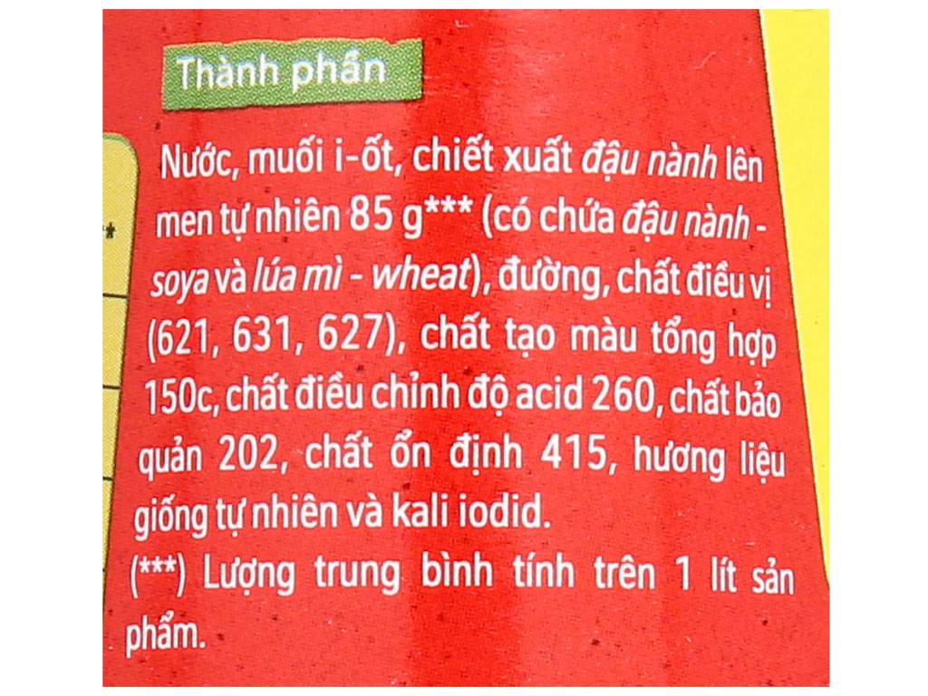 Thành phần: Nước, muối, chiết xuất đậu nành lên men tự nhiên 85g (đậu nành - soya, lúa mì - wheat, muối), đường, chất điều vị 621, màu tổng hợp 150c, chất điều chỉnh độ chua 260, chất ổn định 415, chất bảo quản 202, chất điều vị (631, 627), hương nước tương tổng hợp và kali iodid.