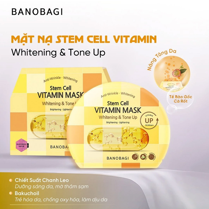 Một làn da sáng mịn, đều màu luôn là niềm mong ước của nhiều chị em. Mặt nạ Banobagi Stem Cell Vitamin Mask Whitening And Tone Up mang đến giải pháp dưỡng trắng và nâng tông tức thì, giúp gương mặt rạng rỡ, đầy sức sống chỉ sau vài phút thư giãn.