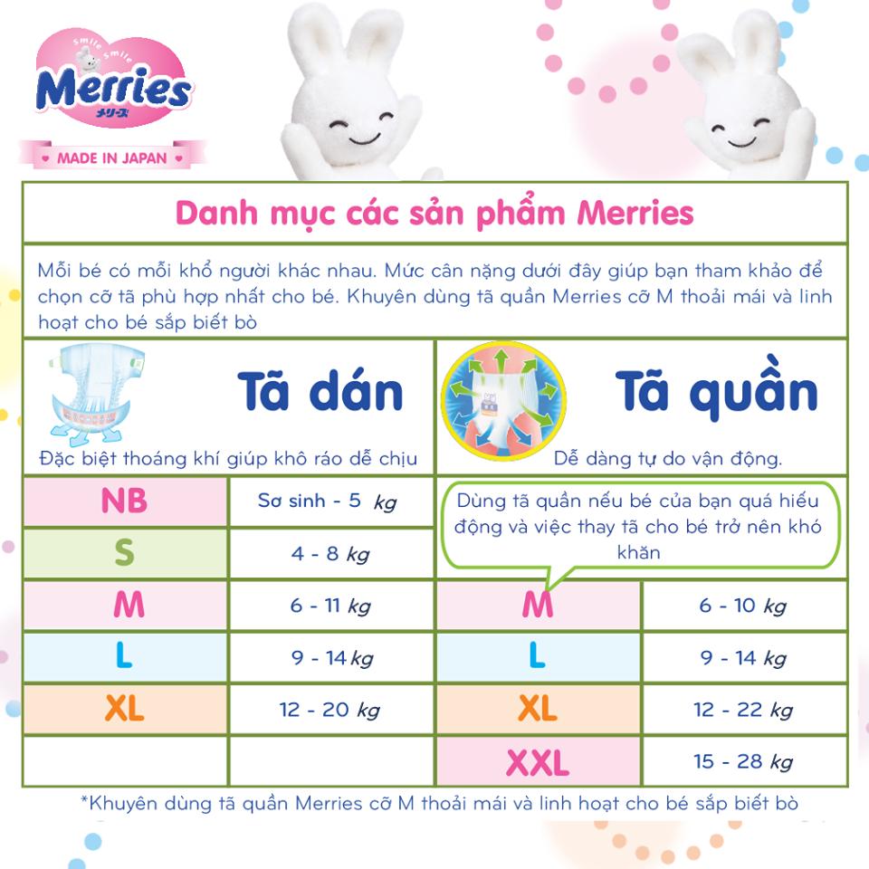 Ra đời vào năm 1983, Merries là thương hiệu tã giấy cao cấp của tập đoàn KAO, Nhật Bản. Sản phẩm luôn là sự tin dùng của các bà mẹ tại Nhật và nhiều quốc gia. Với phương châm mang đến những sản phẩm có giá trị, vì sự hài lòng của người tiêu dùng, Merries luôn không ngừng nỗ lực phát triển các sản phẩm tã bỉm cao cấp, phù hợp với làn da mỏng manh của bé. Các loại tã của Merries đem đến sự thông thoáng, mềm mại tuyệt vời giúp bé linh hoạt trong mọi chuyển động, tự do vui đùa. Với công nghệ ""4 siêu"" - siêu mềm mại, siêu thông thoáng, siêu thấm hút, siêu linh hoạt, tã dán Merries trở thành ""người bạn"" của hàng ngàn em bé trên toàn thế giới.