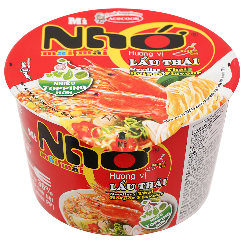 Sợi mì vàng dai ngon quyện trong nước súp mì Nhớ Mãi Mãi hương vị lẩu Thái đậm đà thơm ngon cực đã cùng mùi hương thơm lừng ngất ngây. Mì lẩu Thái Nhớ mãi mãi tô 84g tiện lợi lại vô cùng hấp dẫn là lựa chọn hoàn hảo cho những bữa ăn vội vàng nhưng vẫn đủ chất