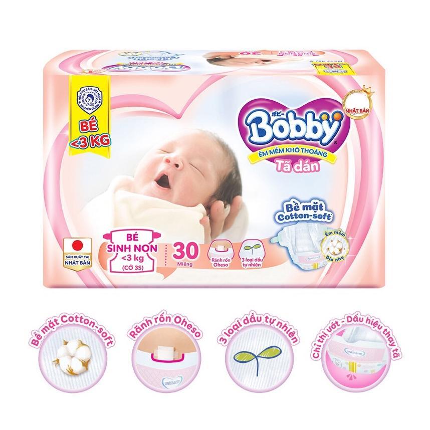 Tã dán Bobby cỡ 3S: Dành cho bé sinh non/ thiếu tháng, cân nặng dưới 3kg.
